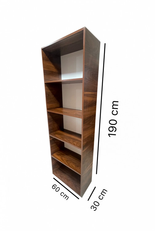 قفسه و کتابخانه قهوهای پنج طبقه عرض ۶۰، عمق ۳۰ و ارتفاع ۱۹۰ سانتیمتر – طراحی کاربردی برای نظمدهی کتاب، وسایل دکوری و لوازم منزل