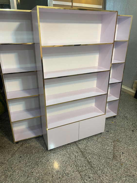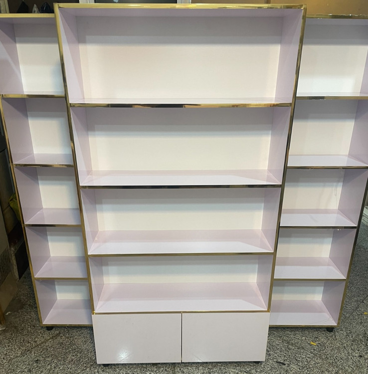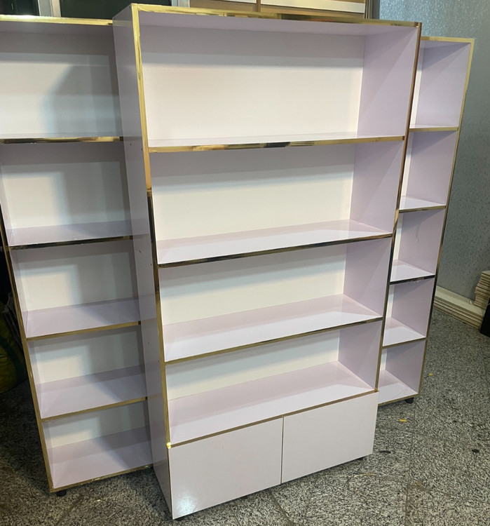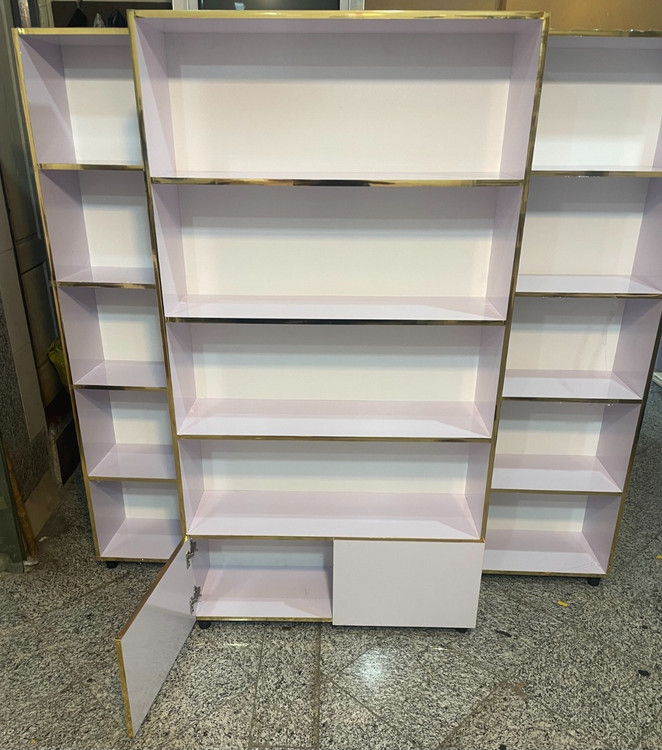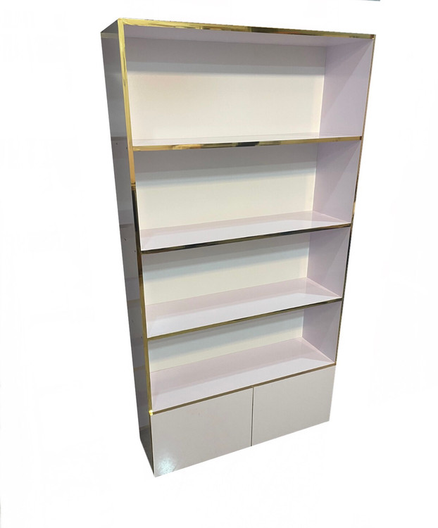 قفسه و کتابخانه مدرن پنجطبقه با درب دوقلو پایین، عرض ۹۰ عمق ۳۰ ارتفاع ۱۹۰ سانتیمتر، لبهطلایی شیک مناسب دکور منزل و فروشگاه