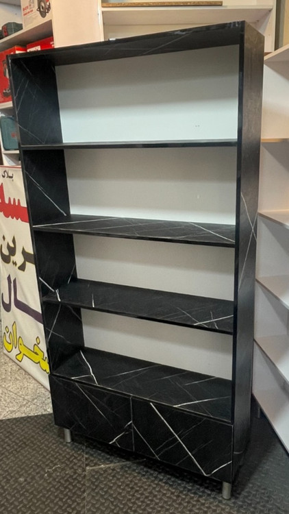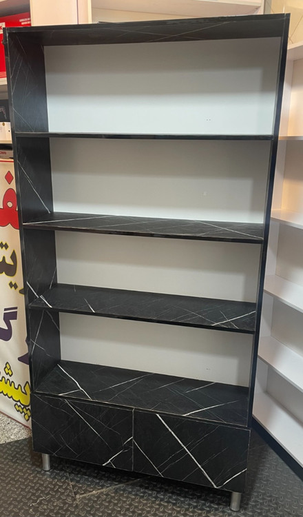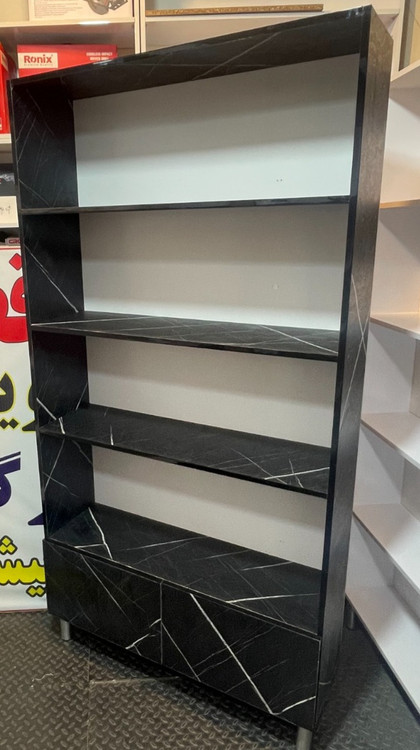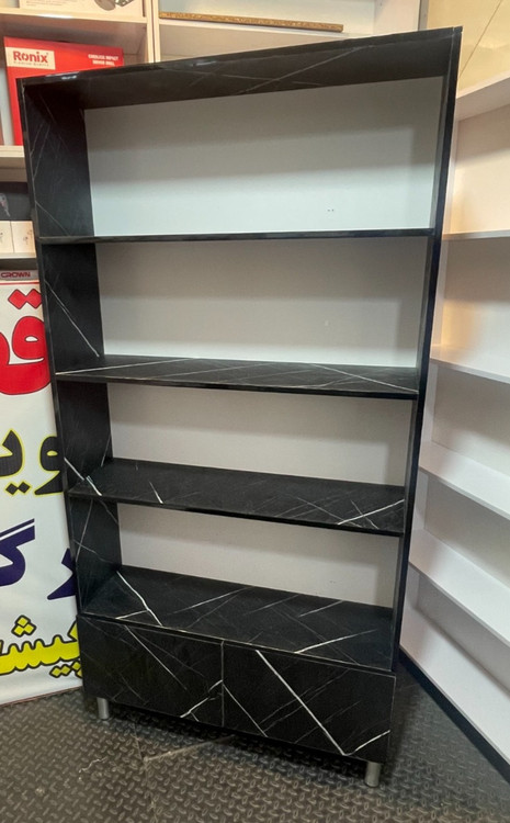 قفسه ام دی اف با ابعاد ۹۰×۳۰×۱۹۰ سانتیمتر، دارای ۵ طبقه کاربردی و دو درب پایینی مشکی با طرح سنگ برجسته. این محصول با ویژگی ضد خش بودن، انتخاب ایدهآلی برای فضاهای پرترافیک است.